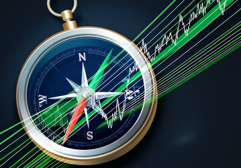 Illustration of a compass guiding a financial chart with Fibonacci Channels showing dynamic support and resistance