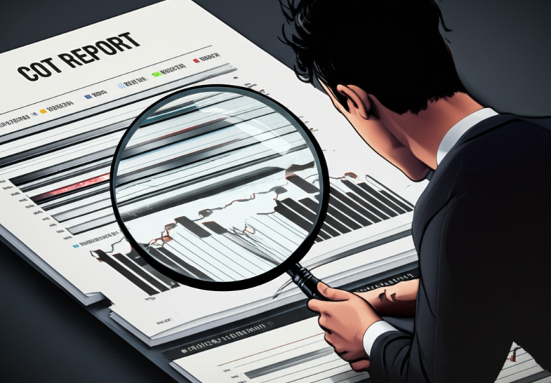 Illustration of a person analyzing complex charts with silver bars and lines, reflecting market sentiment and trader positions, with a magnifying glass over a 'COT Report' document